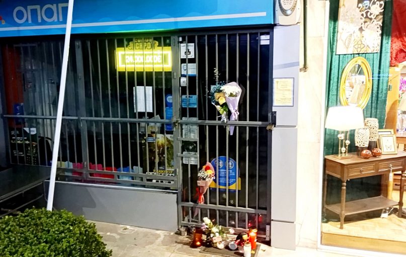 Τράβηξα τη φωτογραφία χτες πηγαίνοντας να πάρω το τραμ από τη στάση Παναγίτσα του Παλαιού Φαλήρου. Λίγες ώρες πριν είχε εκεί δολοφονηθεί άγρια ο 60χρονος ιδιοκτήτης του μικρού καταστήματος Προ Πο μόλις για λίγα ευρώ. Λίγο μετά η ζωή συνεχιζόταν κανονικά με τα διπλανά καταστήματα, το παλαιοπωλείο και το ρολογάδικο να λειτουργούν κανονικά και τους ανθρώπους να περιμένουν απέναντι τον ερχομό του τραμ. Το μαγαζί είναι κλειστό ενώ λίγα λουλούδια και κεριά “στολίζουν” την πρόσοψη του. Τραγική ειρωνεία ακόμα αναβοσβήνει η digital διαφήμιση των 24 εκατομμυρίων ευρώ. Βλέπετε το μαγαζί θεωρείτο τυχερό. Σε αντίθεση με τον άτυχο καταστηματάρχη του οποίου η κηδεία θα γίνει αύριο.