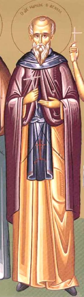 Ο Όσιος Μάρκος ήταν Αθηναίος και έζησε τον 4ο αιώνα μ.Χ. Αφού έλαβε αξιόλογη μόρφωση, εγκατέλειψε την Αθήνα και πήγε στην Αντιόχεια, όπου μαθήτευσε κοντά στον Άγιο Ιωάννη τον Χρυσόστομο ( 13 Νοεμβρίου). Αργότερα εκάρη μοναχός και αφιέρωσε τον εαυτό του στην μελέτη των Θείων Γραφών και έφθασε στον ύψιστο βαθμό της αρετής. Φανερές αποδείξεις και οι λόγοι που εγράφησαν από αυτόν για την ωφέλεια και την ενέργεια των θαυμάτων. Γιατί κάποτε, ενώ ησύχαζε, πλησίασε αυτόν μια ύαινα που είχε το παιδί της τυφλό, με ταπεινή στάση σαν να παρακαλούσε να την ευσπλαχνισθεί για την τύφλωση του μικρού της. Και ο Όσιος, αφού κατάλαβε, έπτυσε στα μάτια του ζώου και αυτό βρήκε την όρασή του. Μετά από ημέρες ήλθε πάλι η ύαινα στον Άγιο, μεταφέροντάς του το δέρμα ενός μεγάλου κριαριού ως ανταπόδοση για την θεραπεία. Αυτός όμως δεν δεχόταν να το λάβει, προτού το θηρίο υποσχεθεί να μην βλάπτει πια τα πρόβατα των πτωχών.