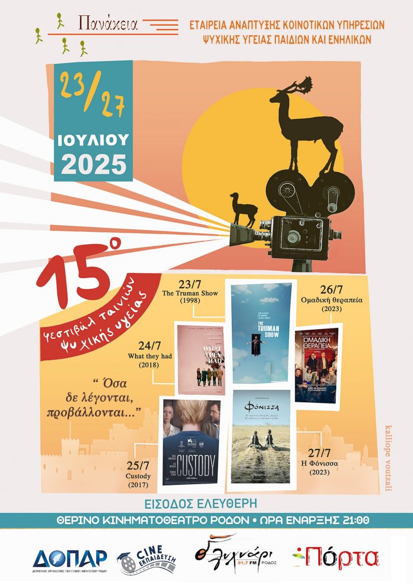 Η πρότυπη Δομή Ψυχικής Υγείας της Ρόδου και της Δωδεκανήσου “Πανάκεια” υπό την προεδρίας του ψυχιάτρου και ιδρυτή Δρ. Αναστάσιου Πλατή για 15η χρονιά συνεχίζει να είναι η χαρά του καλοκαιριού για τους λάτρεις του θερινού κινηματογράφου με ταινίες που έχουν αφήσει ισχυρό αποτύπωμα κοινωνικής ευαισθησίας. Στο θερινό Κινηματοθέατρο “Ρόδον” με ελεύθερη είσοδο για όλους από τις 23-27 Ιουλίου 2025 θα προβληθούν με την σειρά οι ταινίες : “The Truman Show”-Μια Αγαπημένη Οικογένεια (What They Had) -“Custody”-“Ομαδική Θεραπεία” – “Φόνισσα” στις 9:00μμ ώρα προβολής.