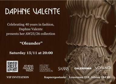 * Η Δάφνη Βαλέντε είναι σχεδιάστρια μόδας διεθνούς κύρους, πρώην πρόεδρος των Ελλήνων Σχεδιαστών Μόδας Η Δάφνη Βαλέντε παρουσιάζει τη συλλογή AW25/26, “OLEANDER” το Σάββατο 15/11/2026, στο…