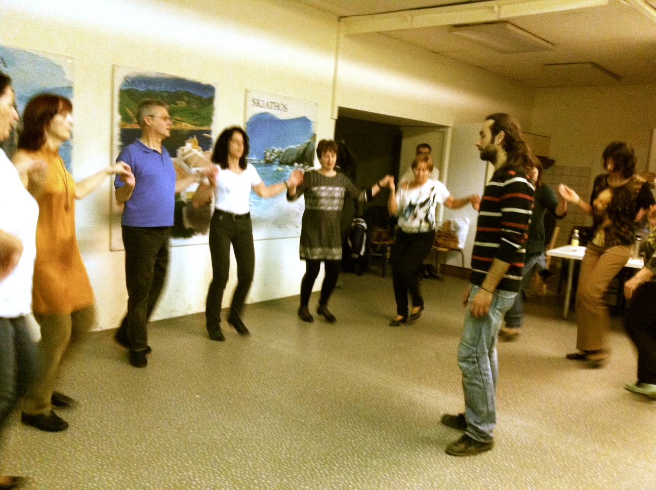 Φτάνουμε στο κτήριο του ΕΟΤ, μπαίνουμε από την διπλανή πόρτα, προσπερνάμε το αέρινο αίθριο και μπροστά μας ξεδιπλώνεται ένας μικρός χόρος, με αφίσσες από όλη την Ελλάδα, μια κουζινούλα και λίγα τραπεζάκια καφενείου (ξέρετε, αυτά τα μεταλλικά που θυμίζουν διαφήμιση ελληνικού καφέ). Ο κόσμος χαρούμενος, περιμένει το νεύμα του δασκάλου για να ξεκινήσει να χορεύει.