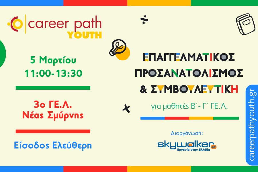 Το skywalker.gr – Εργασία στην Ελλάδα, στο πλαίσιο των πρωτοβουλιών που αφορούν την εκπαίδευση, σε συνεργασία με το 3ο ΓΕ.Λ. Νέας Σμύρνης, διοργανώνει τη δράση Career Path Youth την Τετάρτη 5 Μαρτίου από τις 11:00 έως τις 13:30 στην αίθουσα εκδηλώσεων του 3ου ΓΕ.Λ. Νέας Σμύρνης (Νικομήδειας 7-9, ΤΚ: 17124, Νέα Σμύρνη) για τους μαθητές της Β’ και Γ’ Τάξης των Γενικών Λυκείων.