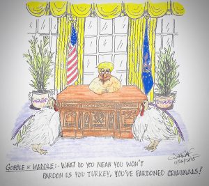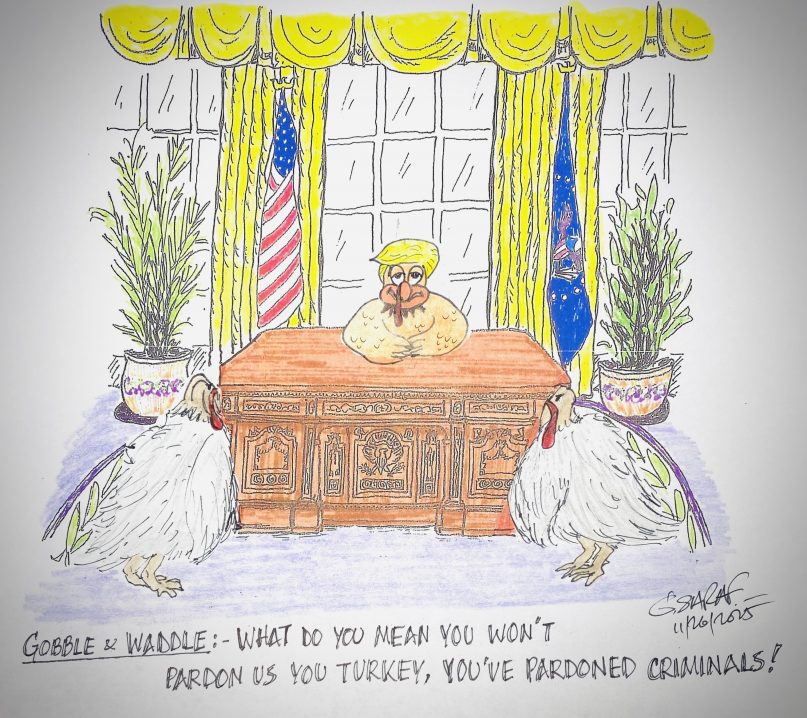 Η απονομή χάριτος εφέτος έγινε την Τρίτη στον Λευκό Οίκο από τον Τραμπ ο οποίος δεν έχασε την ευκαιρία να θίξει τον προκάτοχο του Μπάιντεν απονέμοντας επίσης χάρη στις δύο γαλοπούλες που είχε δώσει χάρη ο Μπάιντεν πέρυσι.