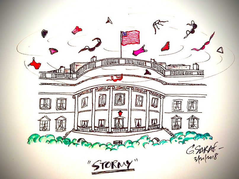 Υ.Γ. – Το σκίτσο είναι από το αρχείο (2018) όταν στο προσκήνιο ήταν η υπόθεση του δεσμού που είχε ο Τραμπ με την πορνοστάρ Stormy Daniels την οποία είχε επιχειρήσει να σιωπήσει το 2016 πληρώνοντας την με χρήματα προερχόμενα από τον προεκλογικό του αγώνα και που δεν μπορούσε να δικαιολογήσει. Είχε χάσει κι εκείνη την δίκη και είχε διασυρθεί ιδιαίτερα στα μάτια της Μελάνιας διότι απεδείχθη ότι ο δεσμός του ήταν ενεργός όταν εκείνη ήταν έγκυος με τον μικρό τους γιό Barron.